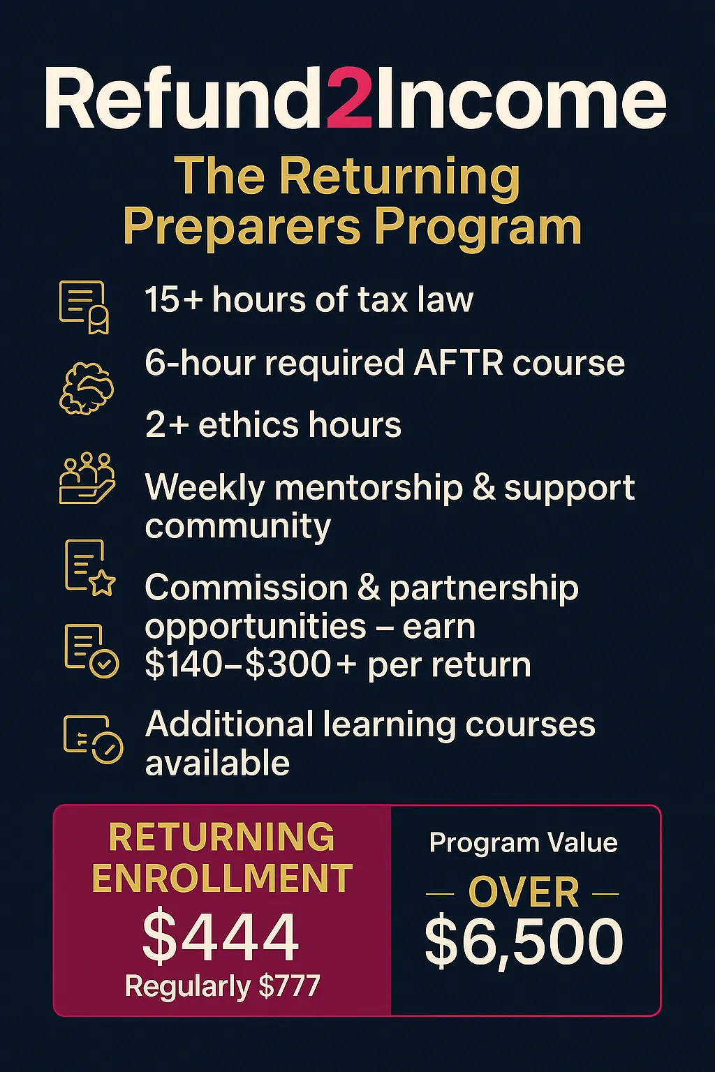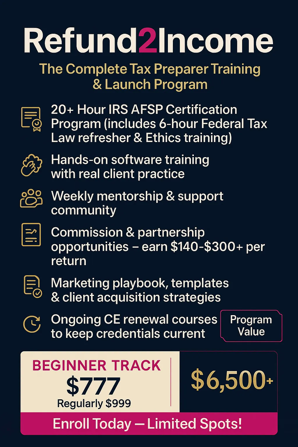 As an IRS-approved Continuing Education provider, she’s helped hundreds of students turn tax knowledge into real income. Melissa created Refund2Income to give you the exact tools, training, and support to go from beginner to confident pro—with the potential to build a profitable tax business on your own terms.