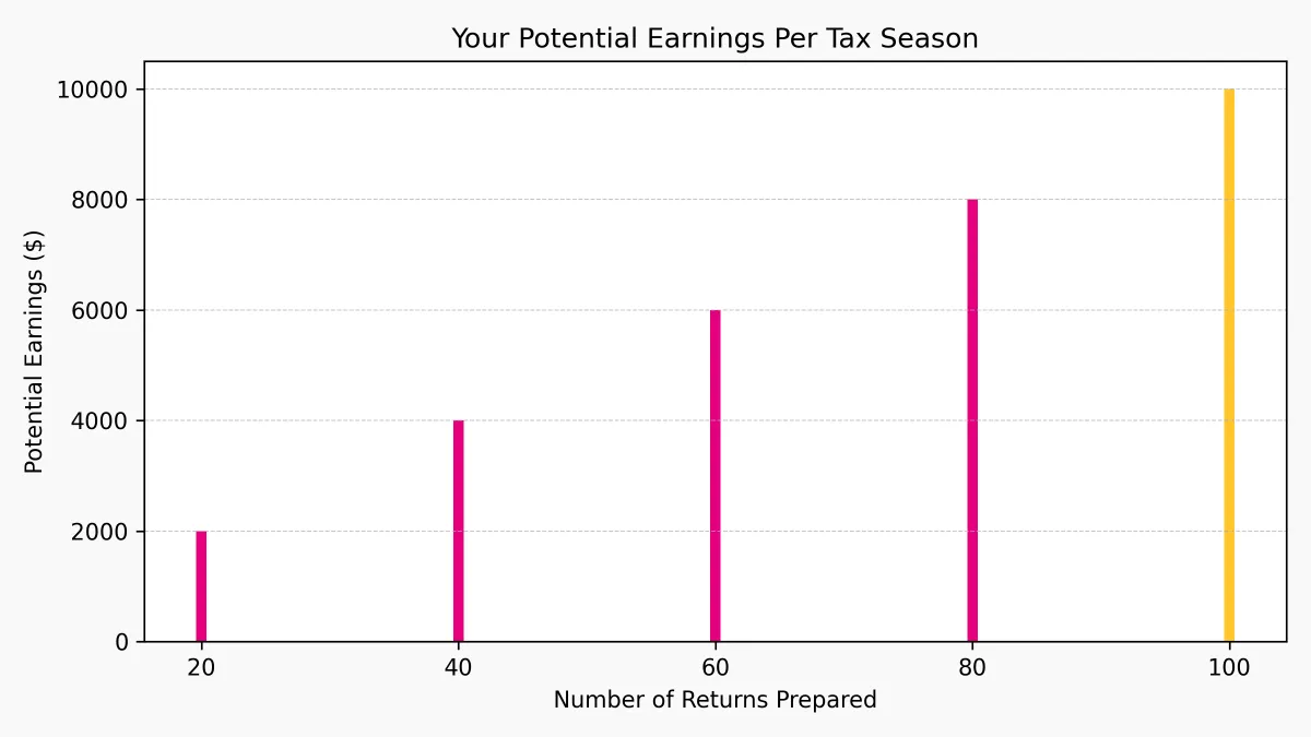 Real results: Our community of tax preparers consistently earns between $2,000–$10,000+ each season. With our support and proven system, you can create life-changing income and freedom for your family.